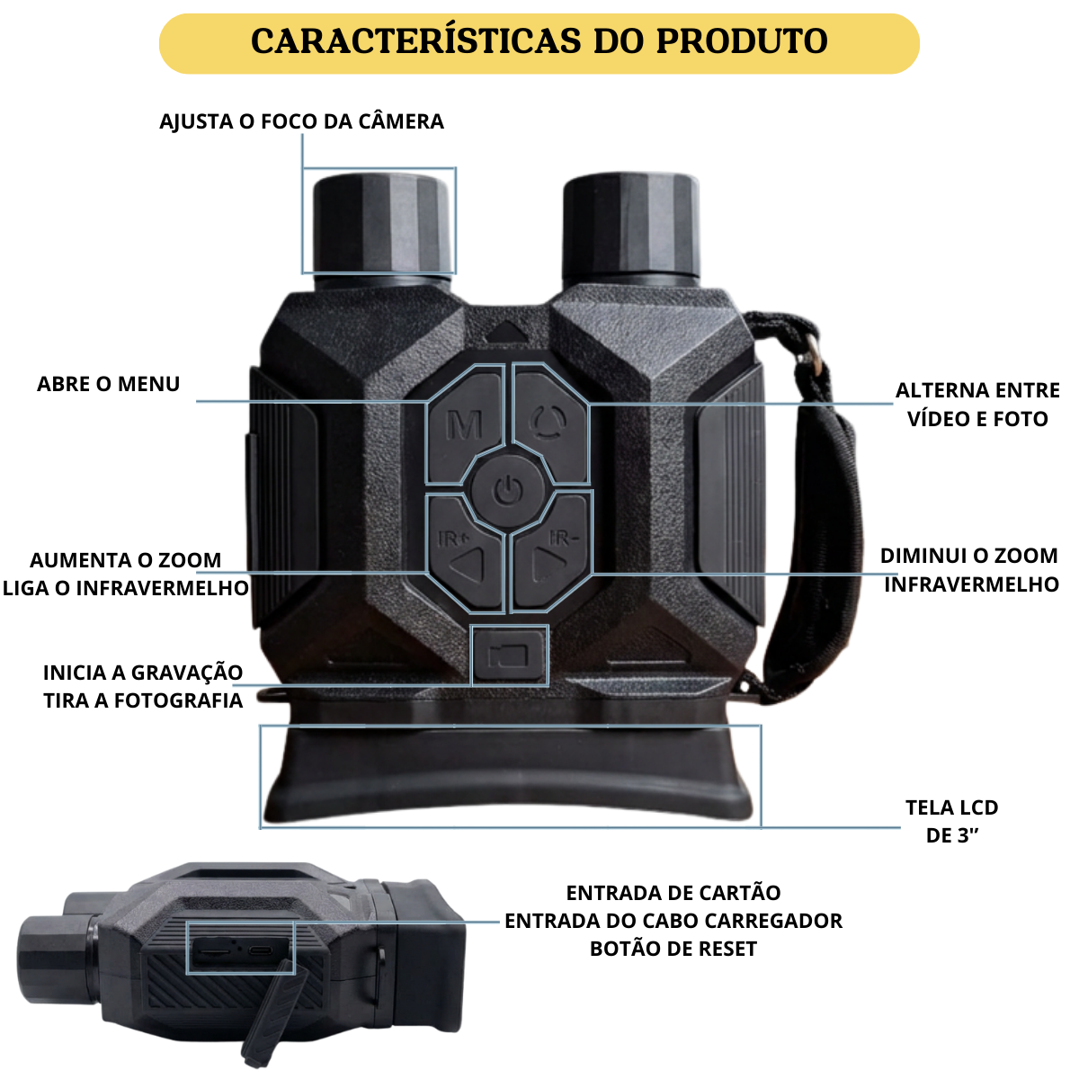 Esse MONÓCULO PROFISSIONAL Utiliza um sensor CMOS sensível ao infravermelho (IR) e uma tela de LCD de 3” polegadas para ampliar sua capacidade de visão noturna. Um iluminador IR incorporado fornece um alcance eficaz de 400 metros em ambiente totalmente escuro.