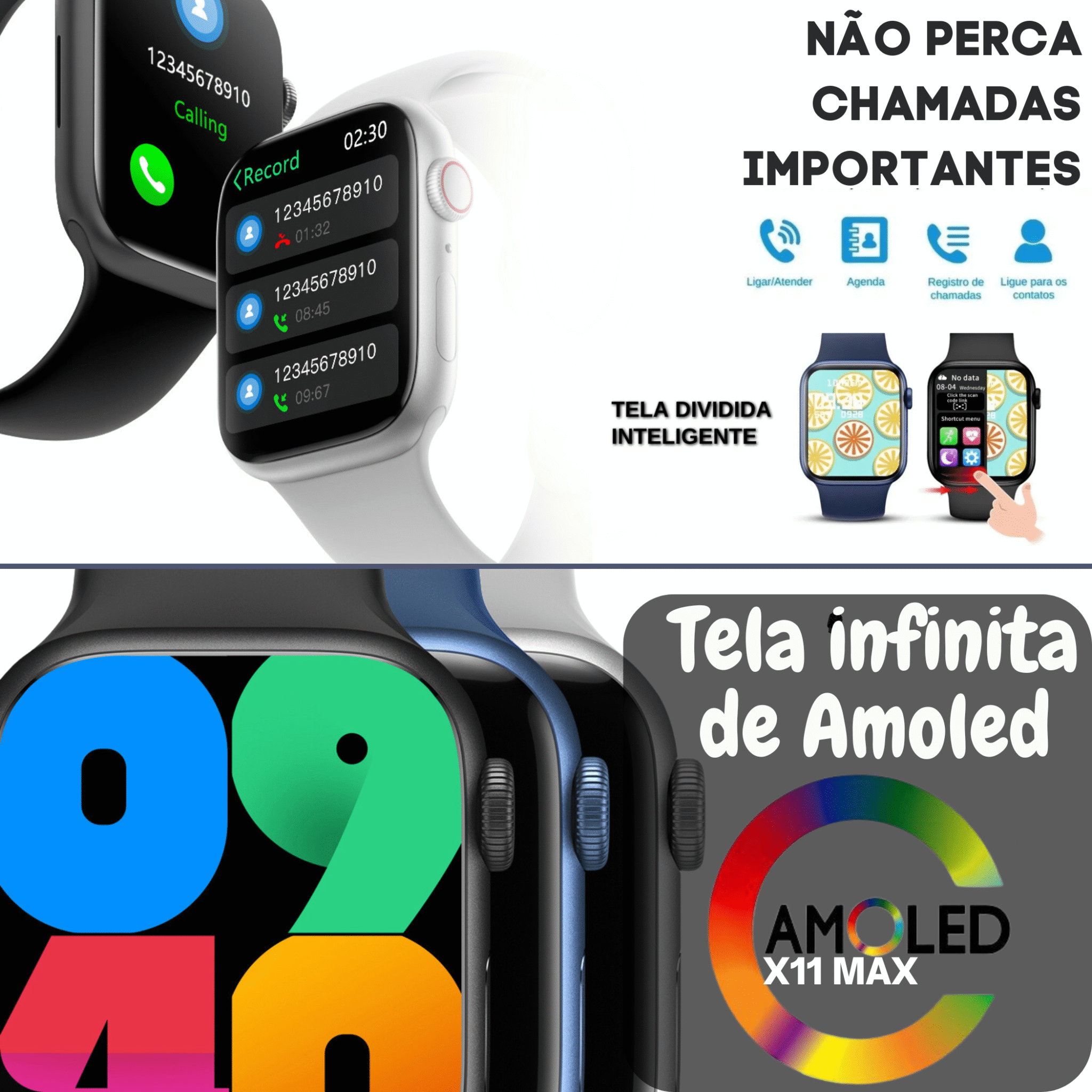 – Tela: AMOLED 2.08”, resolução de 468x548px